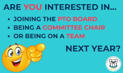 In May we will have elections for next years PTO Board! If you are interested in participating as a board member, being a chair or helping on a committee please click for more information!